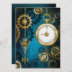 Turquoise, textured, steampunk background with brass and gold gears, a silver key and the clock. Steampunk style.