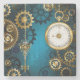 Turquoise, textured, steampunk background with brass and gold gears, a silver key and the clock. Steampunk style.