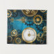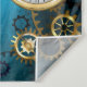 Turquoise, textured, steampunk background with brass and gold gears, a silver key and the clock. Steampunk style.