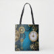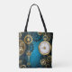 Turquoise, textured, steampunk background with brass and gold gears, a silver key and the clock. Steampunk style.