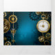 Turquoise, textured, steampunk background with brass and gold gears, a silver key and the clock. Steampunk style.