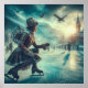 This elegant winter messenger travels along the ice on ice skates in this steampunk Victorian fantasy world towers a tower in this detailed fantasy artwork.