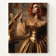 This steampunk Victorian golden astronomer in a gold and brass dress with clockwork gears uses an elegant telescope to observe a historical steampunk fantasy world where retro-futuristic science reigns.