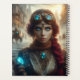 A beautiful Victorian Steampunk lady adventuress wearing gears and goggles with blue eyes and red hair is about to journey fearlessly to her newest steampunk industrial adventure.