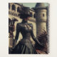A Victorian Steampunk fantasy design of an elegant lady dragon rider in black leather armour with her warhorse brings power and elegance with clockwork gears before a mediaeval castle.