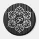 A silver Om design sits inside of a stylised lotus flower. A shadow falls onto the steel mesh background making the flower appear to float just above the surface of the pattern. Six elegant leaves reach out from the centre of the design to create a beautiful symmetrical pattern. Metallic textures and silver colouring gives this Om design a strong, industrial look. This stylish yoga design is a striking representation of this spiritual symbol.