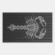 This tribal scorpion is decorated with intricate swirls and dot patterns. Both of the scorpion’s pincers are raised up and its tail and stinger are pointing straight down, creating a symmetrical pattern. The silver arachnid sits on a steel mesh background giving the pattern an aggressive metallic look. This stylish design is a beautiful representation of this beautiful little creature.