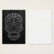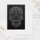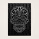 This symmetrical sugar skull design is decorated with intricate light green swirls and dot patterns. The eyes of the skull are made of two circular flowers and there is a five point star in the middle of the forehead. A shadow falls onto the steel mesh background giving the pattern an industrial look. This stylish sugar skull is a unique interpretation of this Day of the Dead symbol.