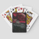 Dramatic illusustration of a Stegosaurus walking through a field of flowers with a firey planet in the background. These playing cards come in a custom cardboard box.