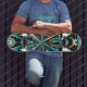 The "Stellar Odyssey Deck" captures the spirit of adventure and discovery from the Atomic Age, reimagined through the lens of Atompunk aesthetics. This skateboard deck graphic features a detailed scene of space exploration, complete with retro-futuristic spacecraft, an intrepid astronaut, and an array of celestial bodies. The design is set against a backdrop of star-studded space, rendered in a palette of metallics, teals, and oranges, invoking the nostalgia and optimism of the 1950s and 60s. It’s a tribute to the era's vision of space travel, tailored for today's skateboarder who dreams of cosmic adventures.