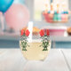 Two red roses in four groups around glass. Green stems and leaves.