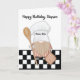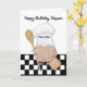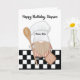 The Stepson Birthday card is a whimsical masterpiece featuring a delightful gnome baker immersed in the joy of baking. This charming character wears a baker's hat, and a bushy beard adds a touch of whimsy to his appearance. In one hand, the gnome holds a wooden spoon, a symbol of culinary creativity, and in the other, a pot holder, ready for some kitchen magic. The backdrop of the card is set in a lively kitchen environment, with chequered floors enhancing the culinary theme.
