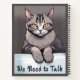 Journal in an illustration of a stern-looking grey tabby cat with piercing yellow eyes resting its front paws on a ledge, gazing directly forward with an air of serious authority. Below the cat, bold script reads, “We Need to Talk,” adding humour and drama.