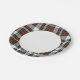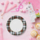 Colourful paper plate done in the classic red, blue, green, blue, white, and yellow Scottish Stewart Dress plaid pattern. A gold tone edge white centre, on the plate, is customisable to add any text you want for any occasion. Perfect for picnics, parties, and holidays.