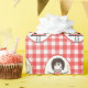 Cute stick figure girl with hair and daisies on red and white gingham background.
