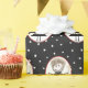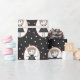 She is wearing sneakers, polka dot dress, and a pearl necklace on matching polka dot background.