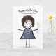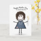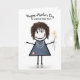 Cute stick figure girl with hair, denim blue dress, pearl necklace, sneakers, and holding a daisy bouquet on white background for stepmom's Mother's Day.