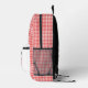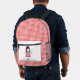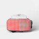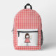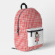 Cute stick figure girl wearing a red and white gingham dress, pearl necklace, sneakers, and holding a bouquet of daisies.