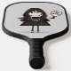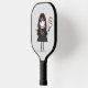 Cute stick figure girl in polka dot dress, sneakers, pearl necklace, and hair with pickleball paddle and orange ball on light grey background.