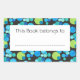 Never lose track of a book again! A sheet of pretty, customisable Bookplates, with a 'Blue Moons' abstract pattern in bright blues and neon green on a black background; from a handpainted paper collage design by Judy Adamson.