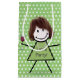 Smiling stick girl with a wine glass, hair, pearl necklace on a green and white polka dot background for birthday.