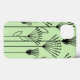 This phone case has a mid-century modern design of plants made from lines, circles, triangles, rectangles, and squares in black on a green background.