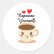 Start your day with a smile and a shot of espresso! This fun and quirky “Espresso Yourself” sticker features a cute coffee cup and a playful pun that’s perfect for coffee addicts, baristas, or anyone who runs on caffeine and sass. Great for decorating laptops, water bottles, notebooks, or anywhere you need a boost of coffee-fuelled personality. Makes a great gift for coffee lovers and pun enthusiasts!