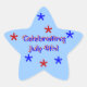 Text in red, white and blue reads "Celebrating July 4th!" Red and blue stars float in blue background. Use to decorate party invitations, placemats, name cards, etc. for your celebration gathering.