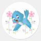 This round sticker is shown in white with a cute bluebird and pink flowers print.