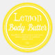This sticker is a label for lemon body butter. Use this sticker on your handmade products such as gifts for family, for use at markets and fetes or for a small business venture you're growing.