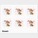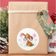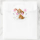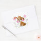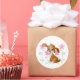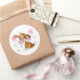 This round sticker is shown in white with a cute puppy and pink flowers print.