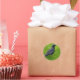 Round sticker with little black bird in the grass.