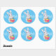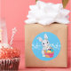 This round sticker is shown in a festive Easter Bunny with eggs print in a lovely sky blue colour.