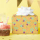 This wrapping paper features an abstract design resembles the sticky hands we all played with as kids. The sticky hand designs could easily be flowers too, depending on your point of view! Either way, these fun designs are purple and aqua and are set on an orange background with dots and sets of stripes.