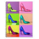 Notebook in Mid-Century style poster art of stiletto pumps / high heels in multiple, bright primary colours