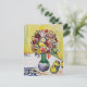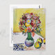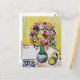 A fine art postcard with the painting Still Life Flowers and Three Apples (1910) by the German Expressionist artist August Macke (1887-1914). A bouquet of wildflowers in a green vase on a table with fruit against a yellow background.