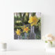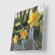 3 bright yellow and orange daffodils of various species, are held in 3 vintage British bottles, with an ancient Roman road, the Fosse Way, as a backdrop.
