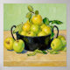 A black bowl filled with vibrant green apples sits on a wooden table. The apples, with their glossy skins and leaves, overflow the bowl, creating a harmonious composition.