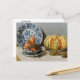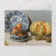A fine art postcard with the impressionist painting, Still Life with Melon, (1872) by Claude Monet (1840-1926). A vibrant table setting of a ripe melon and peaches beside a blue and white porcelain plate.