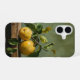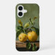 A beautifully detailed still life painting, this image showcases two ripe quinces resting on a rustic wooden surface, surrounded by lush green leaves. The background is a muted olive green with a textured, painterly quality, complementing the warm golden tones of the fruit. The attention to detail in the leaves, with their curling edges and browning tips, adds a sense of realism, while the interplay of light and shadow enhances the depth. The style is highly realistic, reminiscent of classical still-life paintings from the Dutch Golden Age, capturing the simplicity and beauty of nature with an almost photographic level of precision.