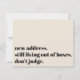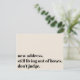 In this tongue-in-cheek card, a bold font was used to render "new address. still living out of boxes. don't judge." on the front. Updated details, along with a friendly "Stay in Touch!" appear on the back. All fonts, colours, and text can be changed to suit your own needs.