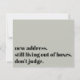 In this tongue-in-cheek card, a bold font was used to render "new address. still living out of boxes. don't judge." on the front. Updated details, along with a friendly "Stay in Touch!" appear on the back. All fonts, colours, and text can be changed to suit your own needs.