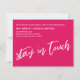 In this piece, the hand-lettered script font was used to create graphics depicting the words "new address. still living out of boxes. don't judge." on the front, and "stay in touch" on the back. The bright raspberry background can be changed to any colour you prefer. Please reach out with any special requests or for customising assistance. // 100 //