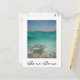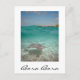 Vertical postcard with an over-under water image of a stingray swimming in the clear blue lagoon of the tropical pacific island Bora Bora, near Tahiti, in French Polynesia during scuba diving with a white border and the text: 'Bora Bora'.