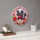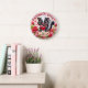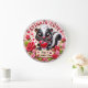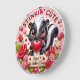This whimsical circular wall clock features a 3D digital illustration of an adorable baby skunk with large, expressive eyes holding a bright red heart. At the top, bold red embossed text with a white outline playfully reads "STINKIN' CUTE". A wooden sign at the bottom displays the embossed text "Happy Valentine's Day" in elegant black script. The character is framed by vibrant pink and red roses with green leaves against a soft pink and cream background. A thin, white decorative border edges the entire design. The clock face border features black, outlined numbers from 1 to 12 positioned around the inner perimeter, with simple black hands centered over the illustration.