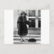 Old 1920s women's fashion photo of woman in fur coat and big hat with what appears to be a skunk on a leash.