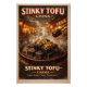 Travel poster featuring traditional Chinese stinky tofu (chòu dòufu) in a bold, atmospheric vintage travel style. Central focus on crispy black stinky tofu cubes sizzling at a night street-food stall, topped with chili sauce, pickled vegetables, and cilantro. Steaming aroma visualized through stylized smoke lines. Background shows a lively Chinese night market with lanterns, wooden stalls, and calligraphy signs softly blurred. Color palette: deep charcoal, dark brown, chili red, warm amber, muted gold. Strong graphic shapes with subtle grain texture. Bold vintage typography: “STINKY TOFU – CHINA” with smaller subtitle “Iconic Street Food Experience”. Vertical 2:3 layout, high-resolution for print.