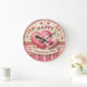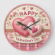 This charming round wall clock features a whimsical 3D-style digital illustration with a cozy, handcrafted aesthetic. The design showcases two large, layered hearts made of pink quilted fabric and striped patterns, complete with decorative buttons and delicate stitching details. The word "HAPPY" is displayed in raised red lettering at the top, while a flowing parchment banner at the bottom carries the elegant message "Valentine's Day." The background consists of rustic white wooden planks adorned with small floating pink hearts and delicate floral vine accents. The perimeter is finished with a soft pink frame, and a pink-and-white plaid pattern decorates the lower section. This functional home accessory is a perfect gift for Valentine Day or anniversaries, adding a touch of shabby chic romance to any bedroom, kitchen, or living space.
