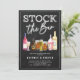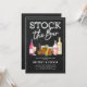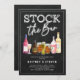 Couples shower engagement party invitations featuring a chalkboard background, a selection of watercolor beers & wines, the saying "stock the bar", and a modern text template that is easy to personalise.