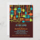 Retro style implements for cooking and eating are featured on this lovely invitation to a "stock the kitchen" Bridal Shower for the bride-to-be. The colour scheme is fun and neutral with forks, spoons, knives, spatulas and whisks in shades of umber, gold, brown and sage green, set against a rich chestnut brown background.